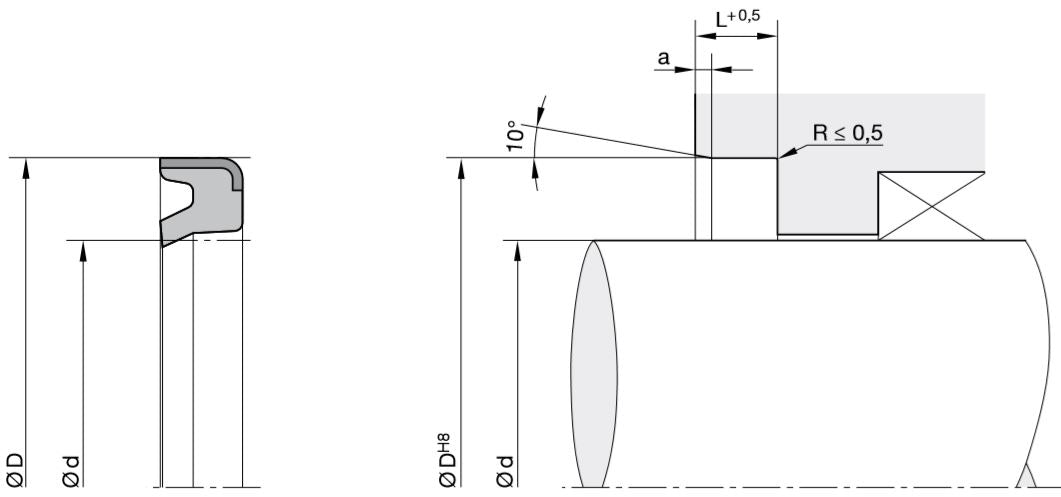 Bei Abstreifringen Profil AF wird der Außendurchmesser D mit einem geringen Übermaß gefertigt, so daß sich beim Einbau in die Ausdrehung / Bohrung DH8 ein einwandfreier Press-Sitz ergibt. Sie können von Hand oder vollautomatisch maschinell eingepresst werden. Die Abstreiflippe sollte nicht mit vorstehenden Kolbenstangenköpfen oder deren Anschlussteilen in Berührung kommen.